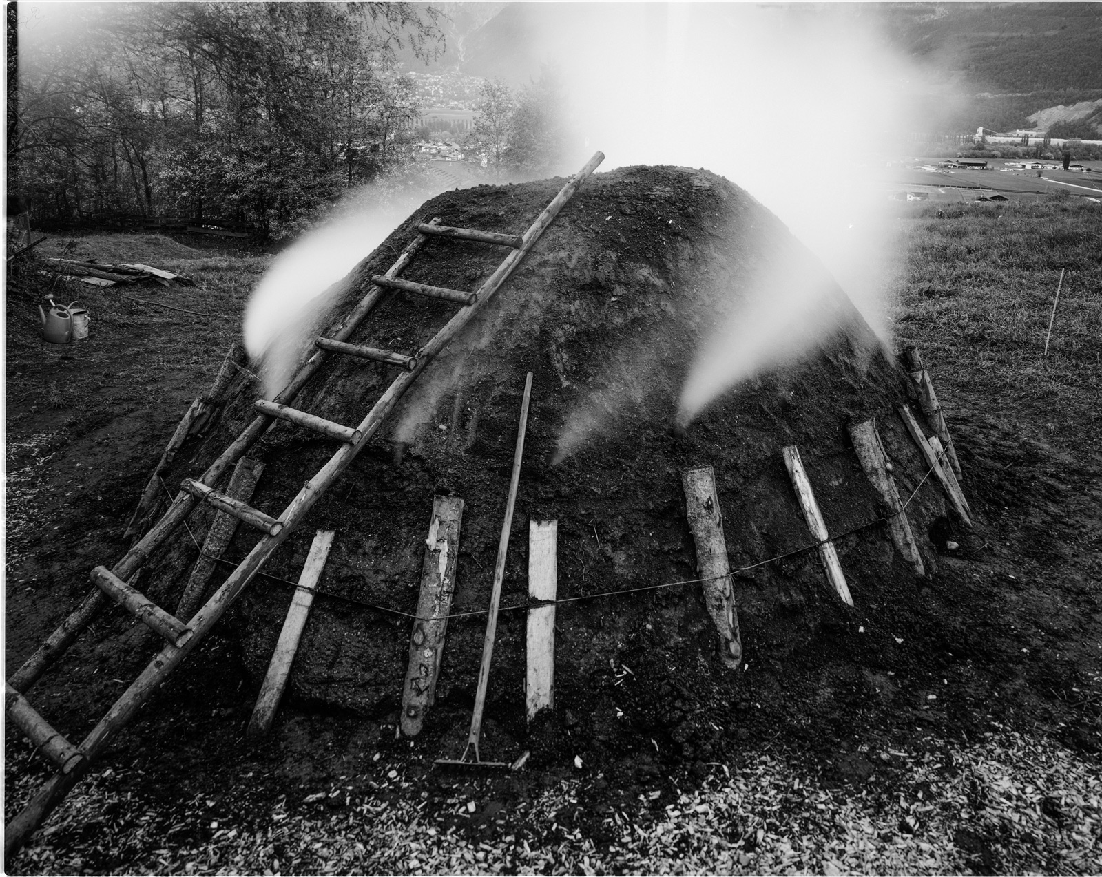 Der fotografierte Meiler wurde als Schauobjekt in Oberhofen, Oberinntal verkohlt. In Tirol wird die Köhlerei derzeit nirgends gewerblich ausgeübt.